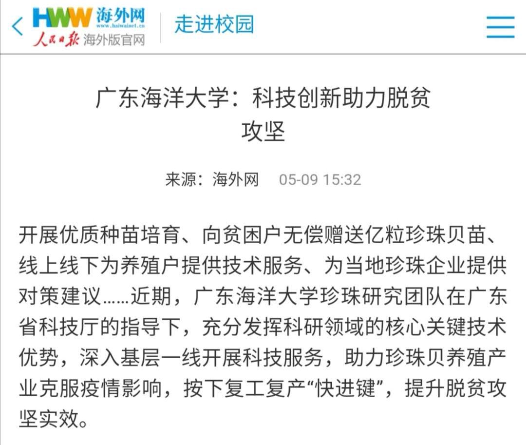 近日,人民日报海外版官网以《伟德国际1946bv官网:科技创新助力脱贫攻坚》为题,南方+广东教育头条以《100000000粒珍珠贝苗!无偿赠送!》为题,对我校珍珠研究团队科技创新助力脱贫攻坚和乡村振兴先进事迹进行了深度报道。其中南方+广东教育头条刊发的新闻报道入选南方+平台“首页收录”和“热文榜五十佳”。