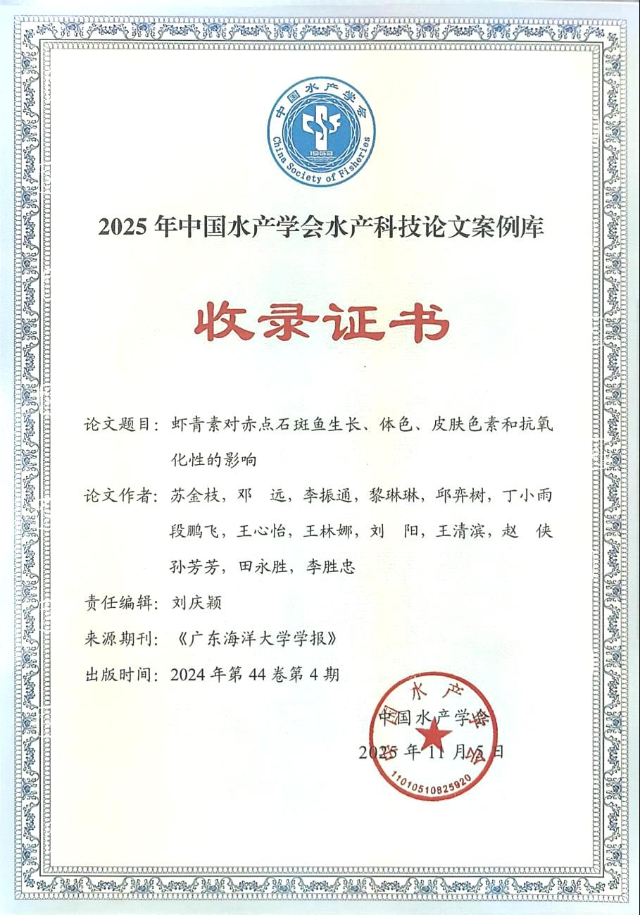 同时,我校章双教授团队发表的论文《饲料中添加β-葡聚糖对珍珠龙胆石斑鱼生长性能、免疫指标、转录组及肠道菌群的影响》,以及《伟德国际1946bv官网学报》刊载的《虾青素对赤点石斑鱼生长、体色、皮肤色素和抗氧化性的影响》入选“2025年中国水产学会水产科技论文案例库TOP10”。这既是对我校科研工作者学术能力的高度认可,也彰显了学报在水产学术研究领域的影响力。