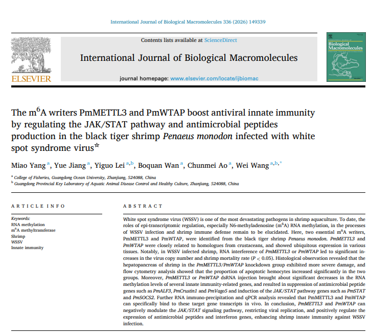 近日,我校伟德国际victor1946甲壳动物遗传育种与增养殖团队在国际著名期刊《International Journal of Biological Macromolecules》(IF=8.5,TOP期刊)发表了题为“The m6A writers PmMETTL3 and PmWTAP boost antiviral innate immunity by regulating the JAK/STAT pathway and antimicrobial peptides production in the black tiger shrimp Penaeus monodon infected with white spot syndrome virus”的研究论文。